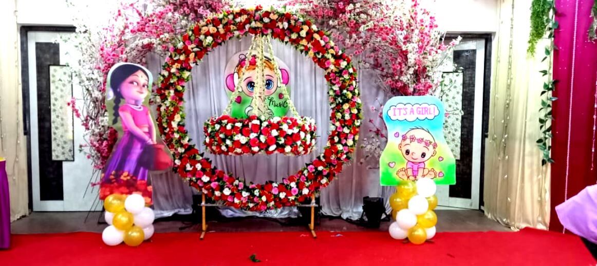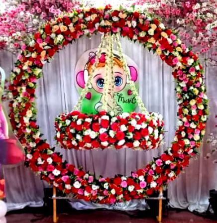 - Ring setup with tokri type jhula with artificial flower decoration