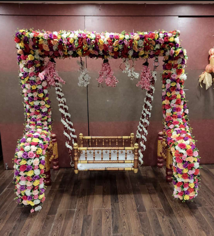 - Wooden sankheda jhula with artificial flower decoration