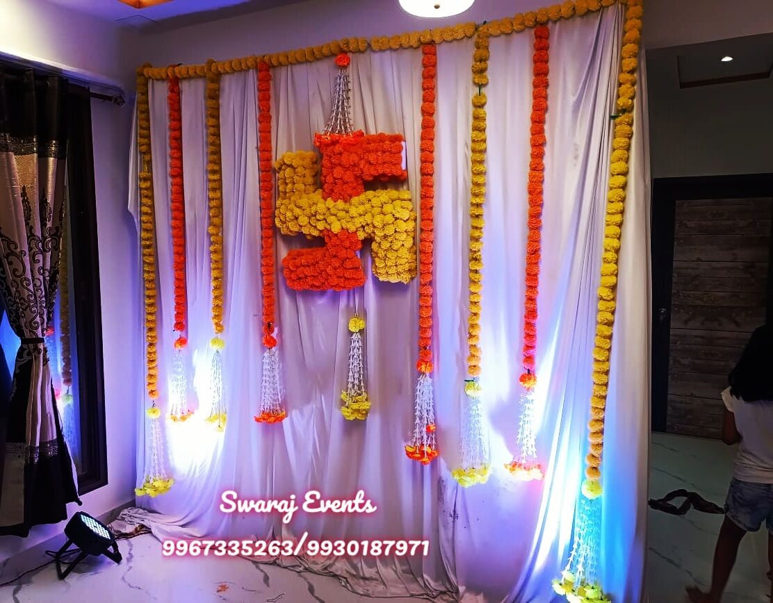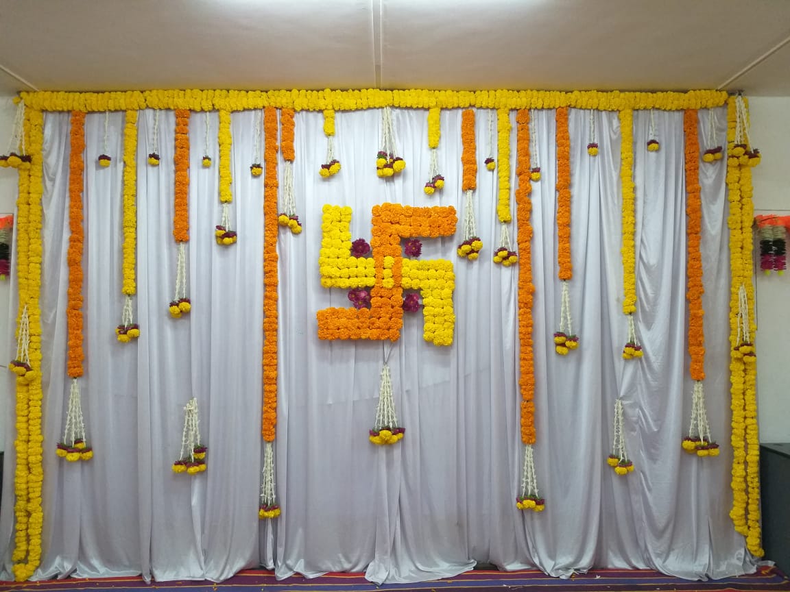 ▪️ Artificial zendu mala and latkan arrangements on backdrop