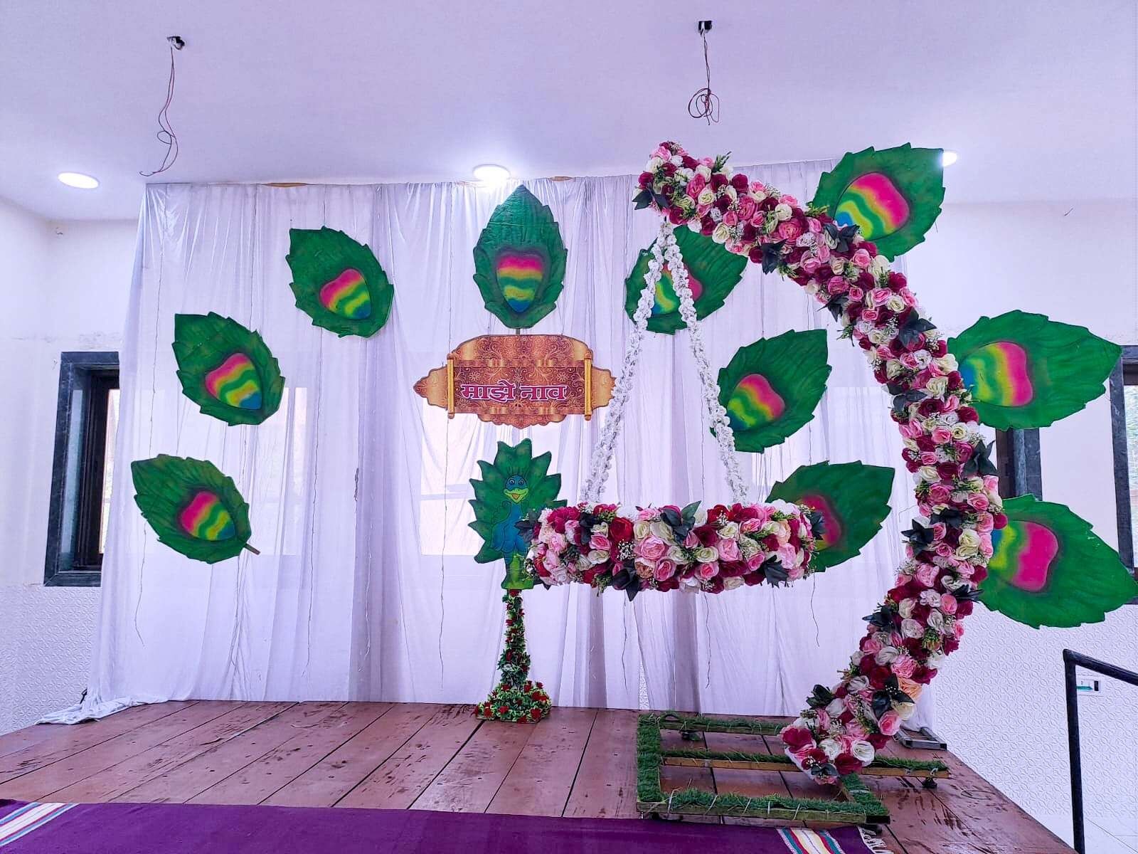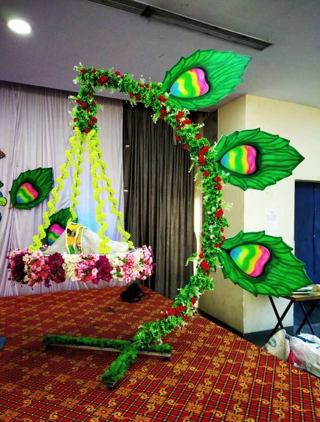 - Jhula with artificial flowers & 3 peacock feathers