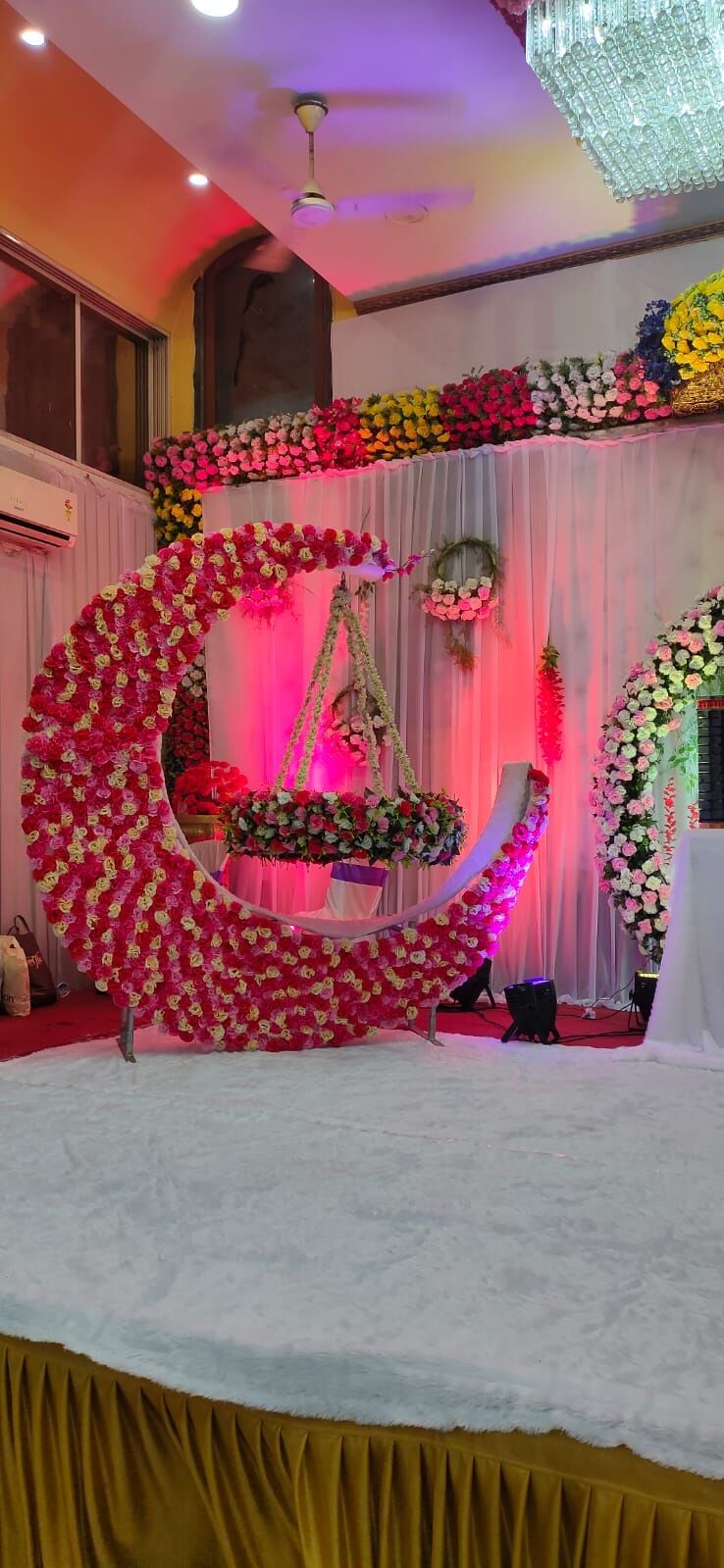 - 3D big Moon Tokri jhula with Red carnation flower arrangemen